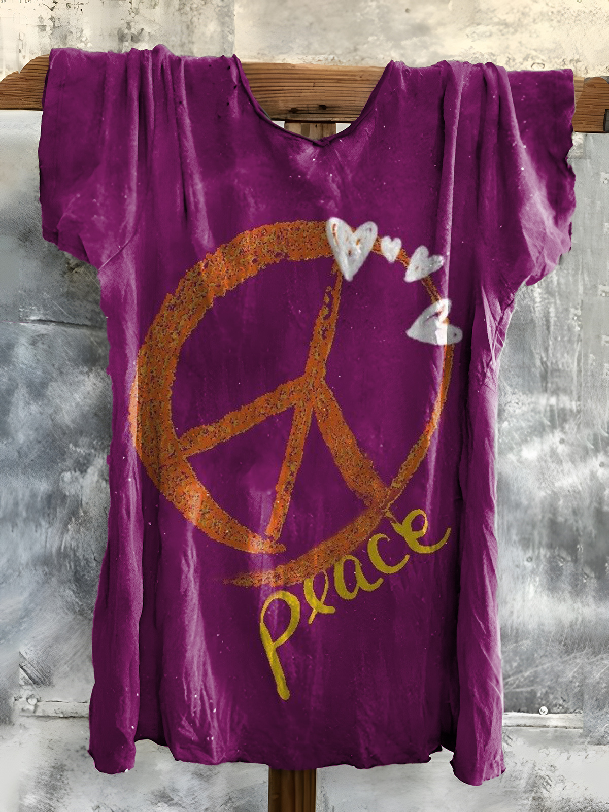Women's Love Peace Hippy Art Print Cotton Crew Neck T-Shirt