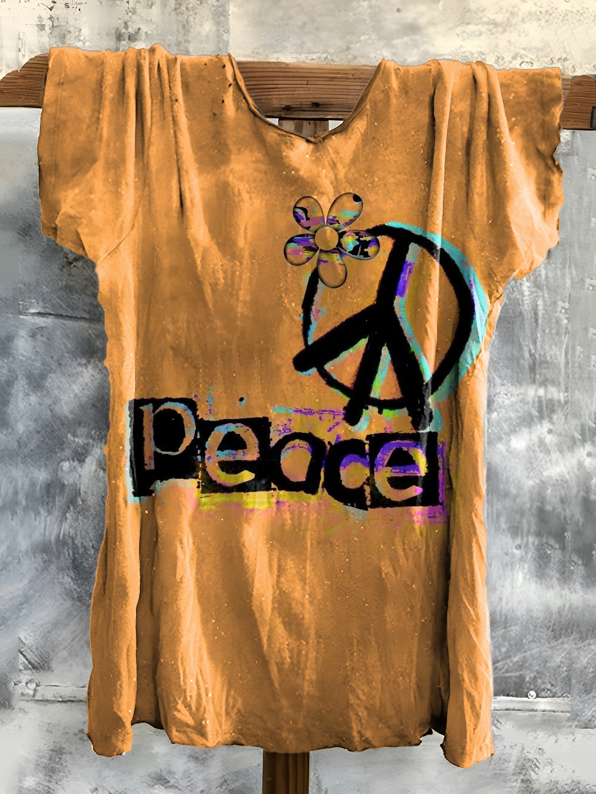 Women's Love Peace Hippy Art Print Cotton Crew Neck T-Shirt