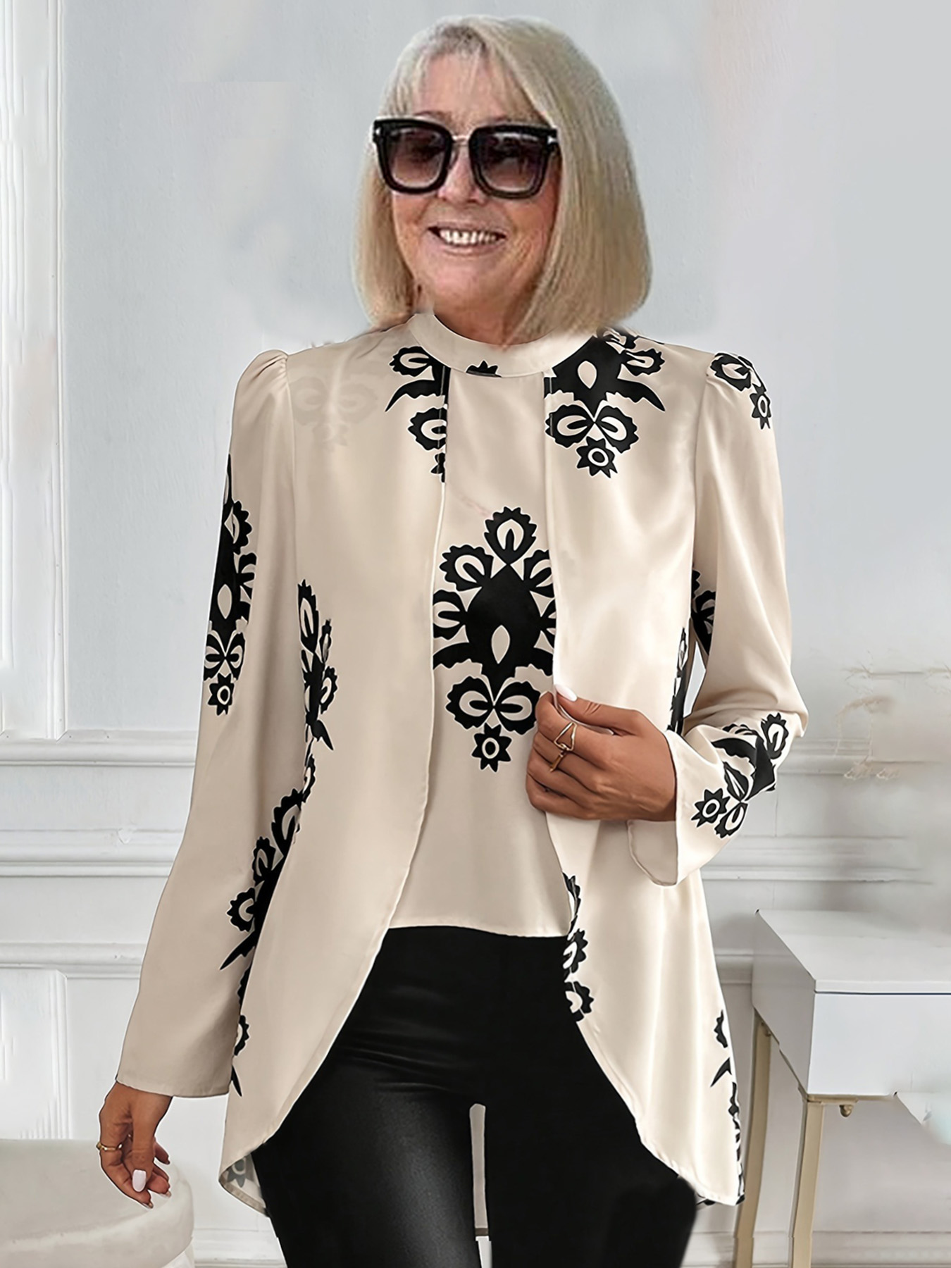 Women's Printed Collar Shirt, Elegant Long Sleeve Blouse, Pretend Two-Piece Top, Polyester, Button Detail, All Seasons, Adult Size, Woven Fabric
