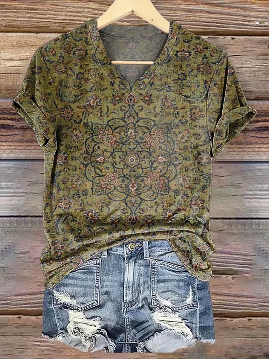 Women's Retro Ethnic Totem Print V-neck Casual T-Shirt