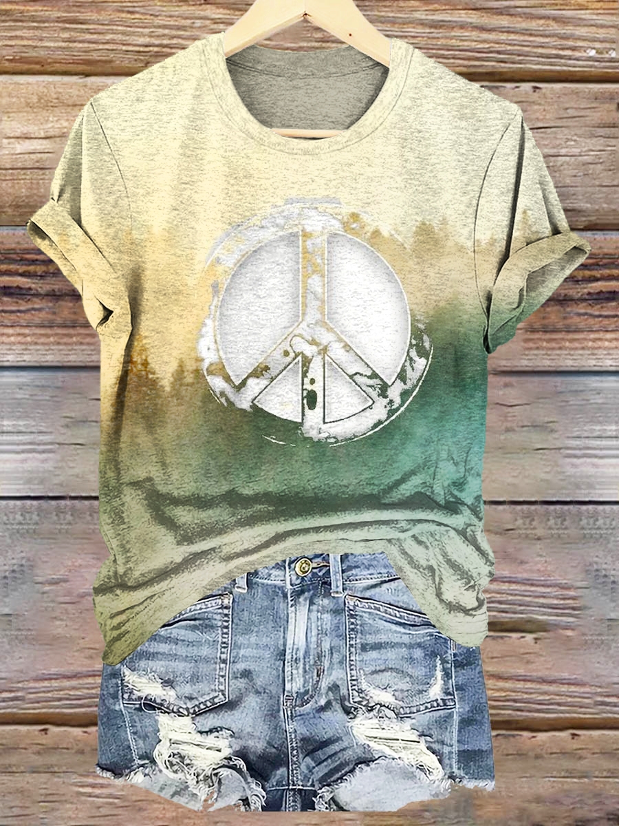 Women's Retro Hippie Peace Sign Print Crew Neck T-shirt