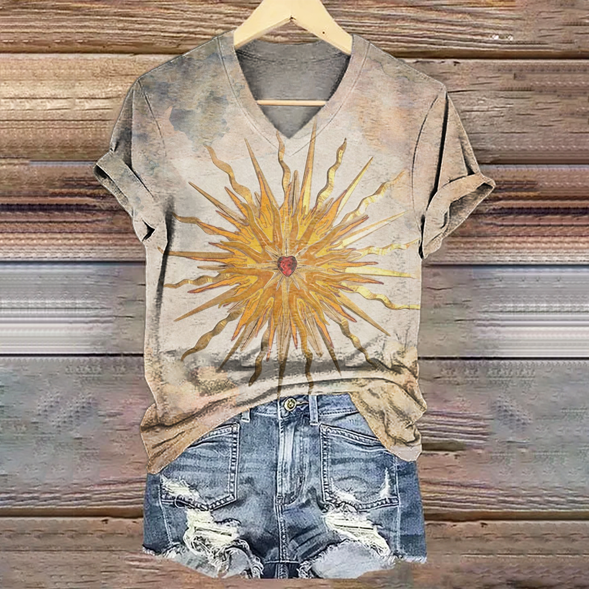 Women's Sun Art Print V-Neck Casual T-Shirt