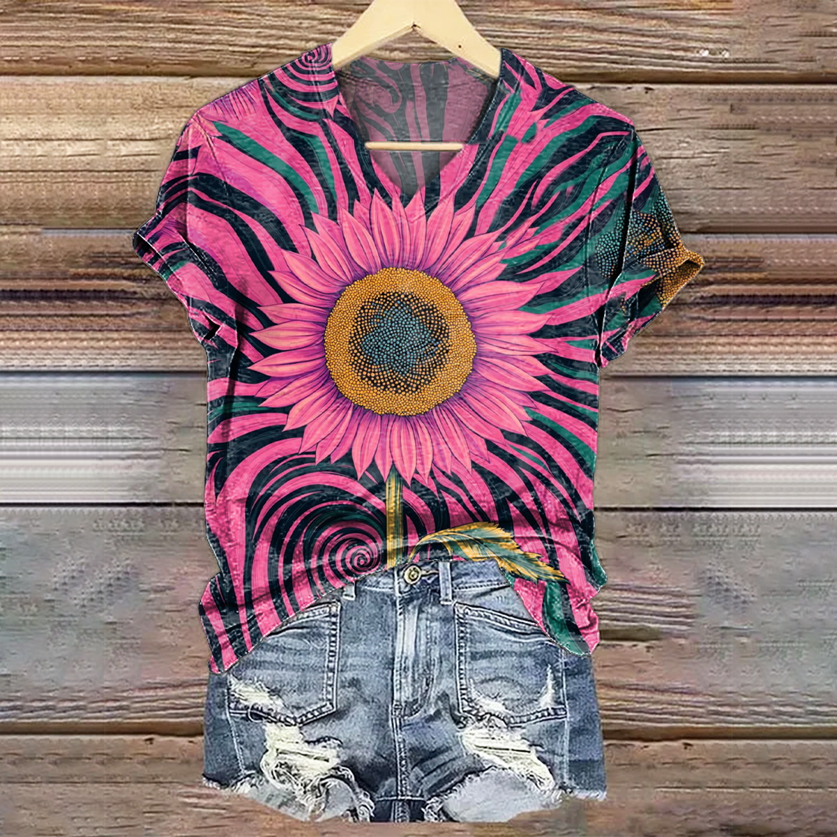 Women's Sunflower Art Print V-Neck Casual T-Shirt
