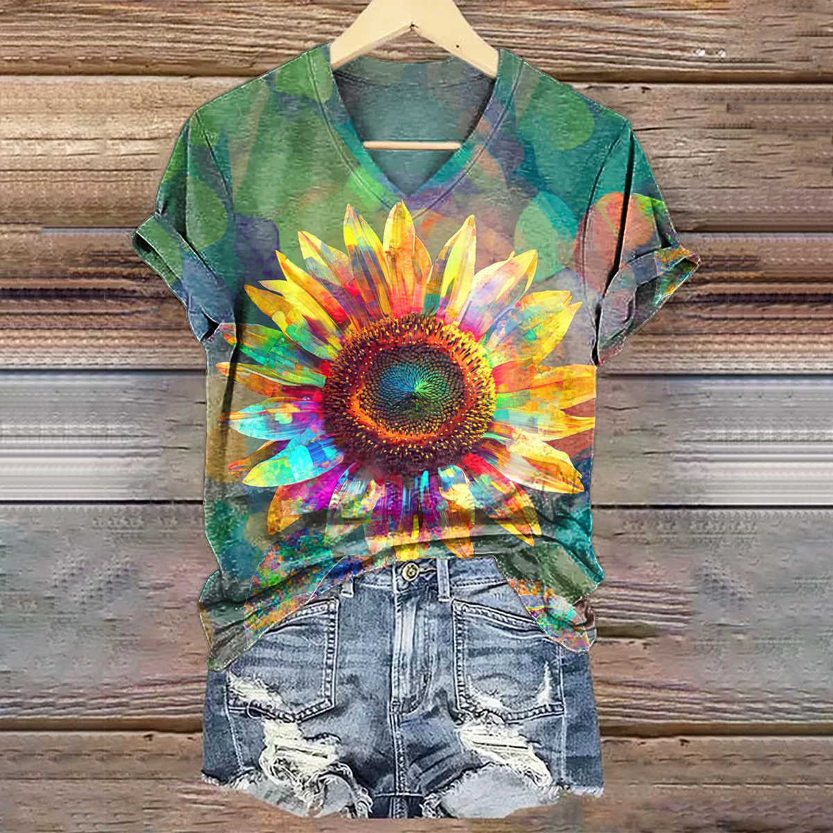 Women's Sunflower Art Print V-Neck Casual T-Shirt