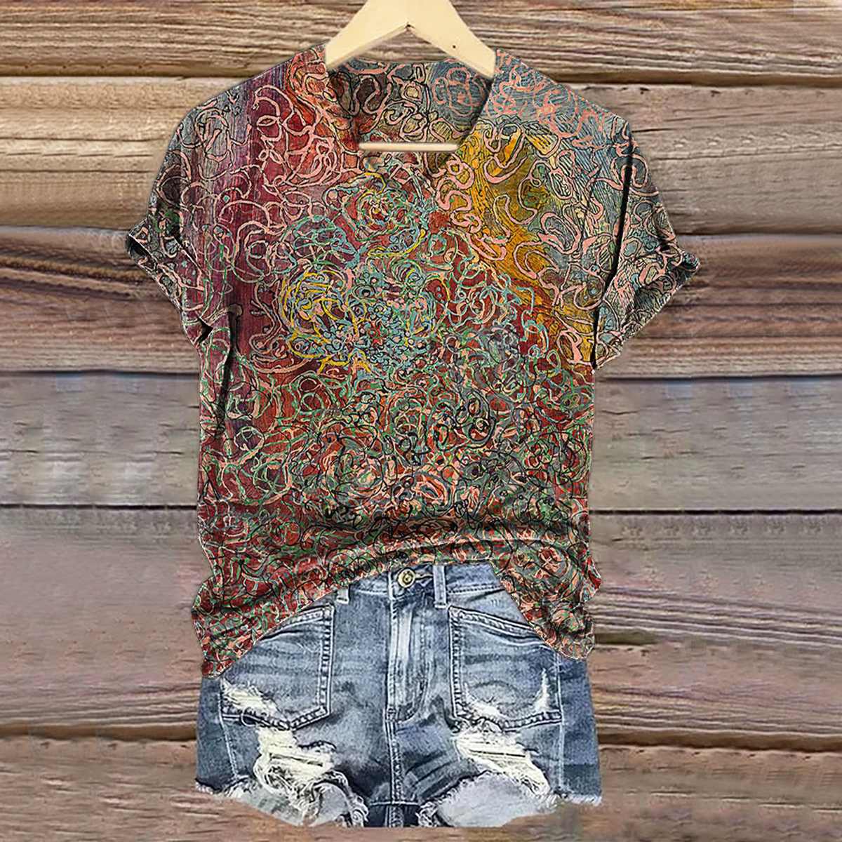 Women's Vintage Art Print V-neck Casual T-Shirt