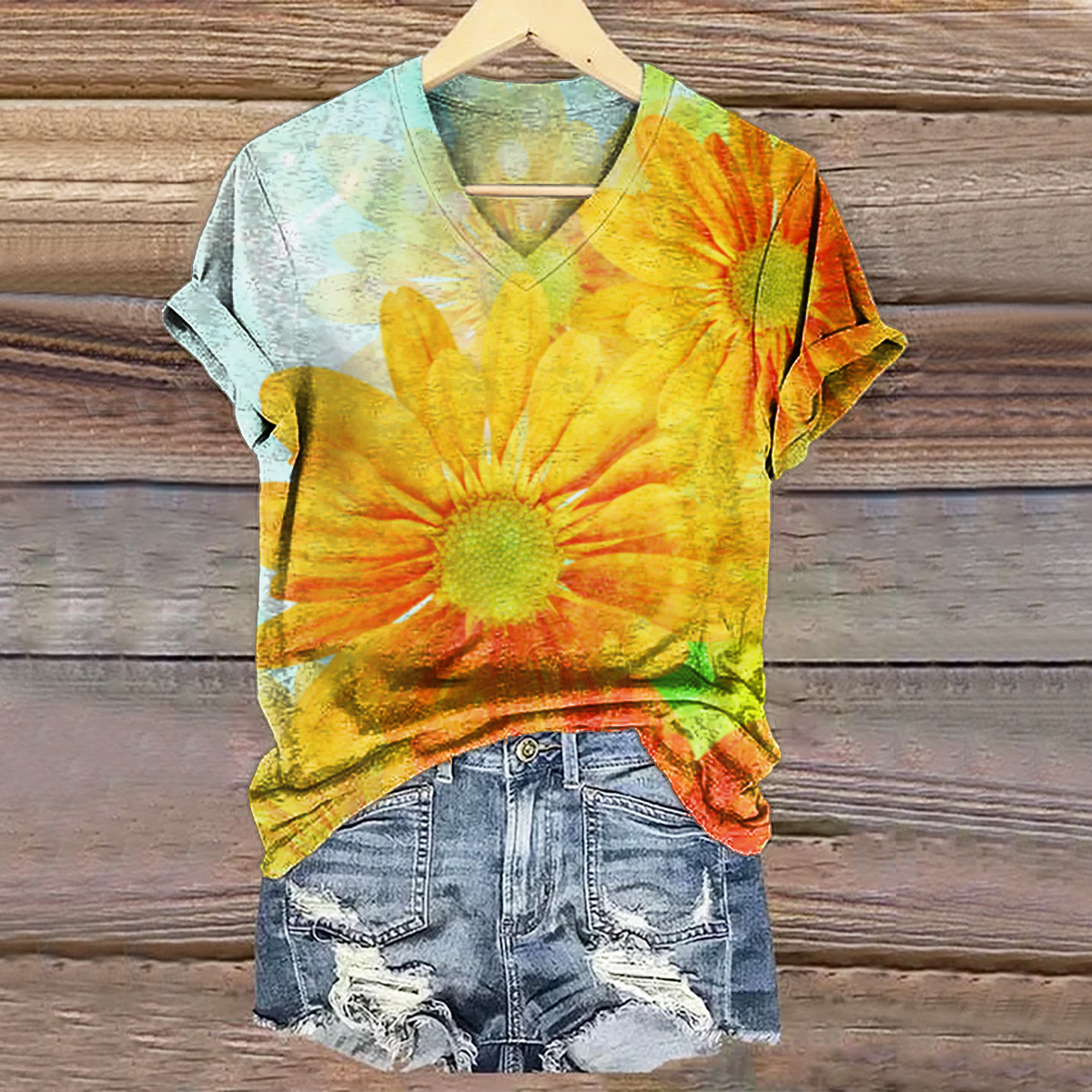 Women's Vintage Daisy Floral Art Print V-neck Casual T-Shirt