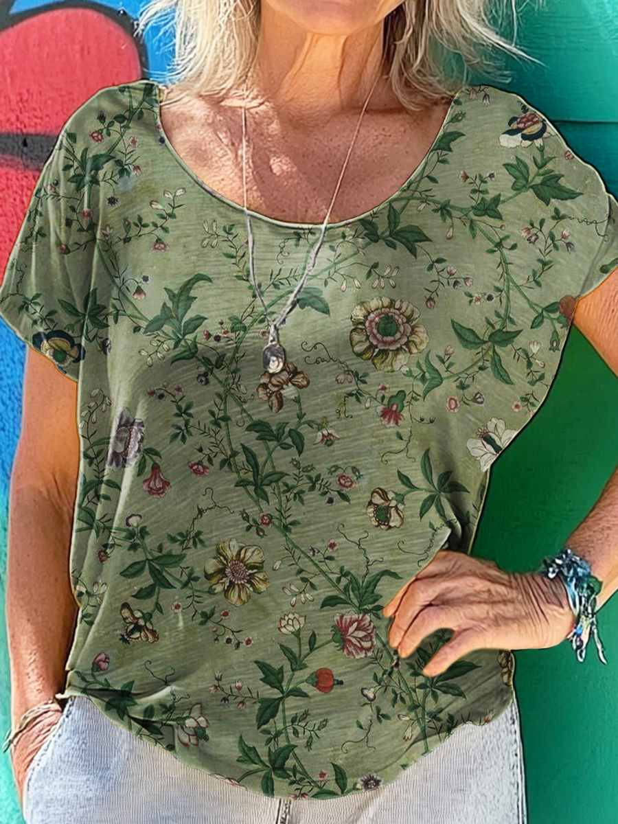 Women's Vintage Ethnic Floral Art Print 100%Cotton Crew Neck T-Shirt
