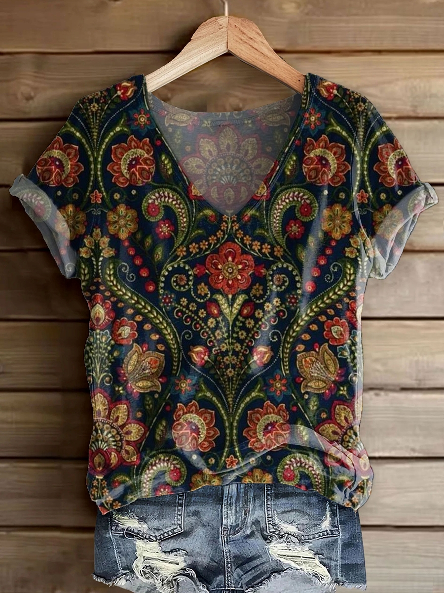Women's Vintage Ethnic Floral Print V-Neck Short Sleeve Cotton T-Shirt