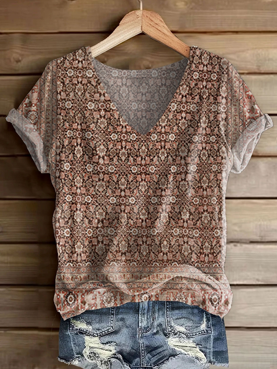 Women's Vintage Ethnic T-shirt with Art Print V-Neck