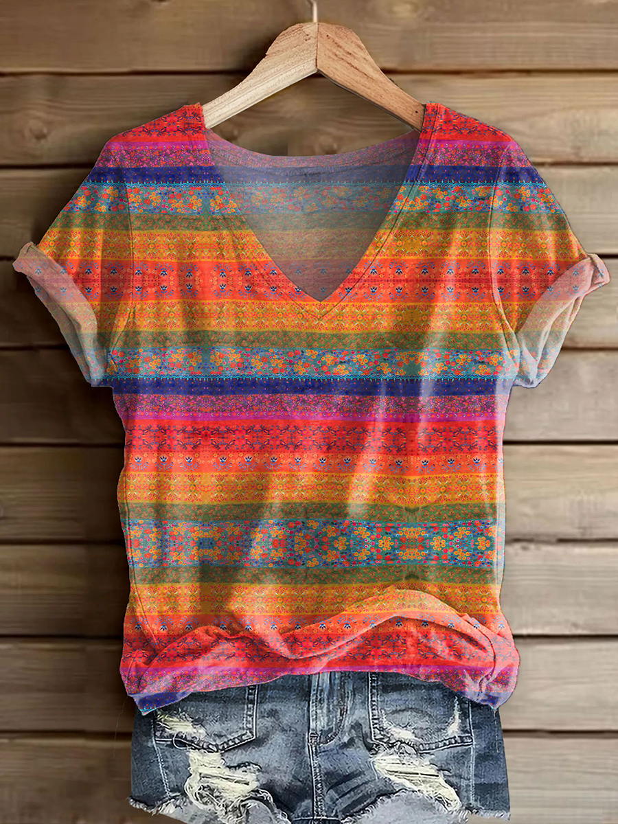 Women's Vintage Floral Art Print V-neck Casual T-Shirt