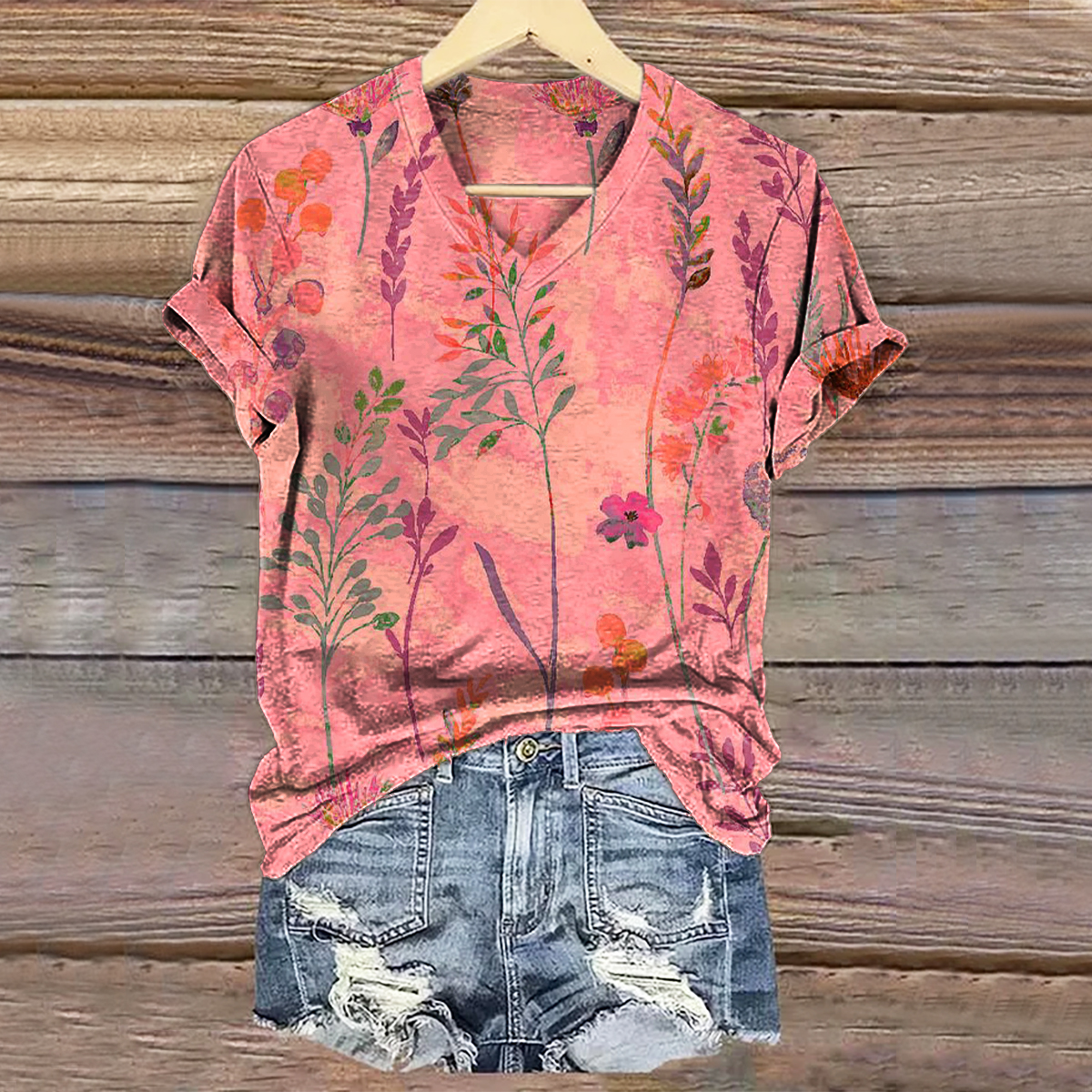 Women's Vintage Floral Art Print V-neck Casual T-Shirt