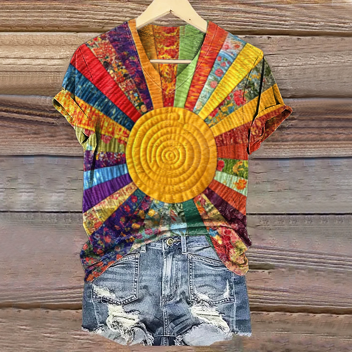 Women's Vintage Floral Art Print V-neck Casual T-Shirt