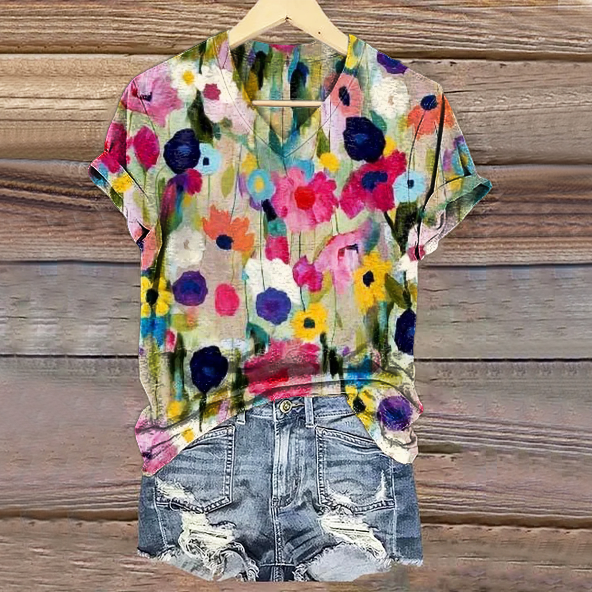 Women's Vintage Floral Art Print V-neck Casual T-Shirt