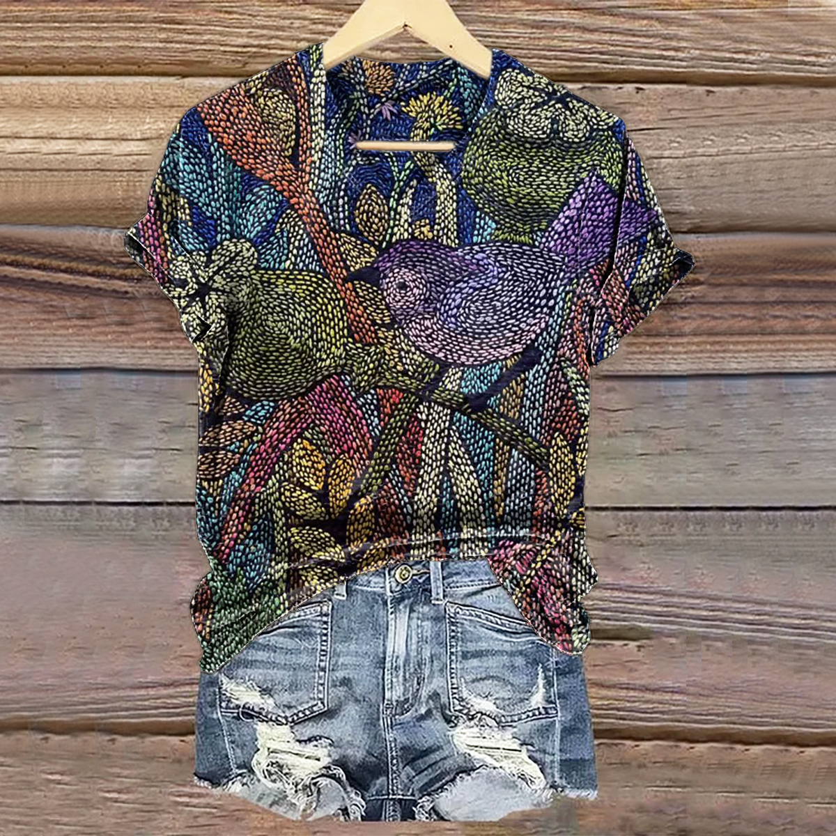 Women's Vintage Floral Bird Art Print V-neck Casual T-Shirt