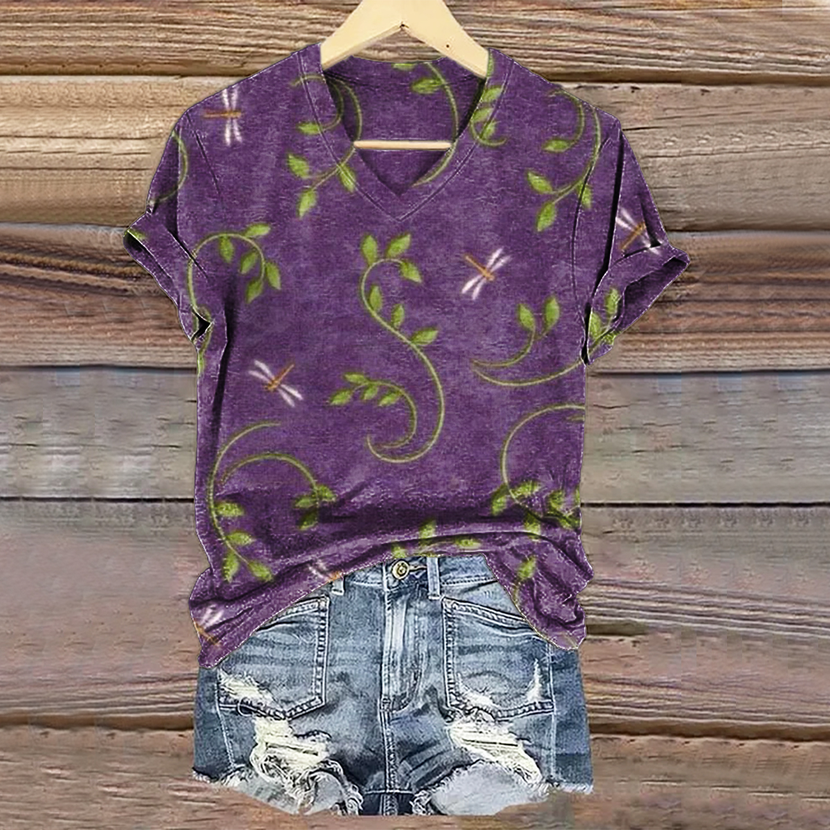 Women's Vintage Floral Dragonfly Art Print V-neck Casual T-Shirt