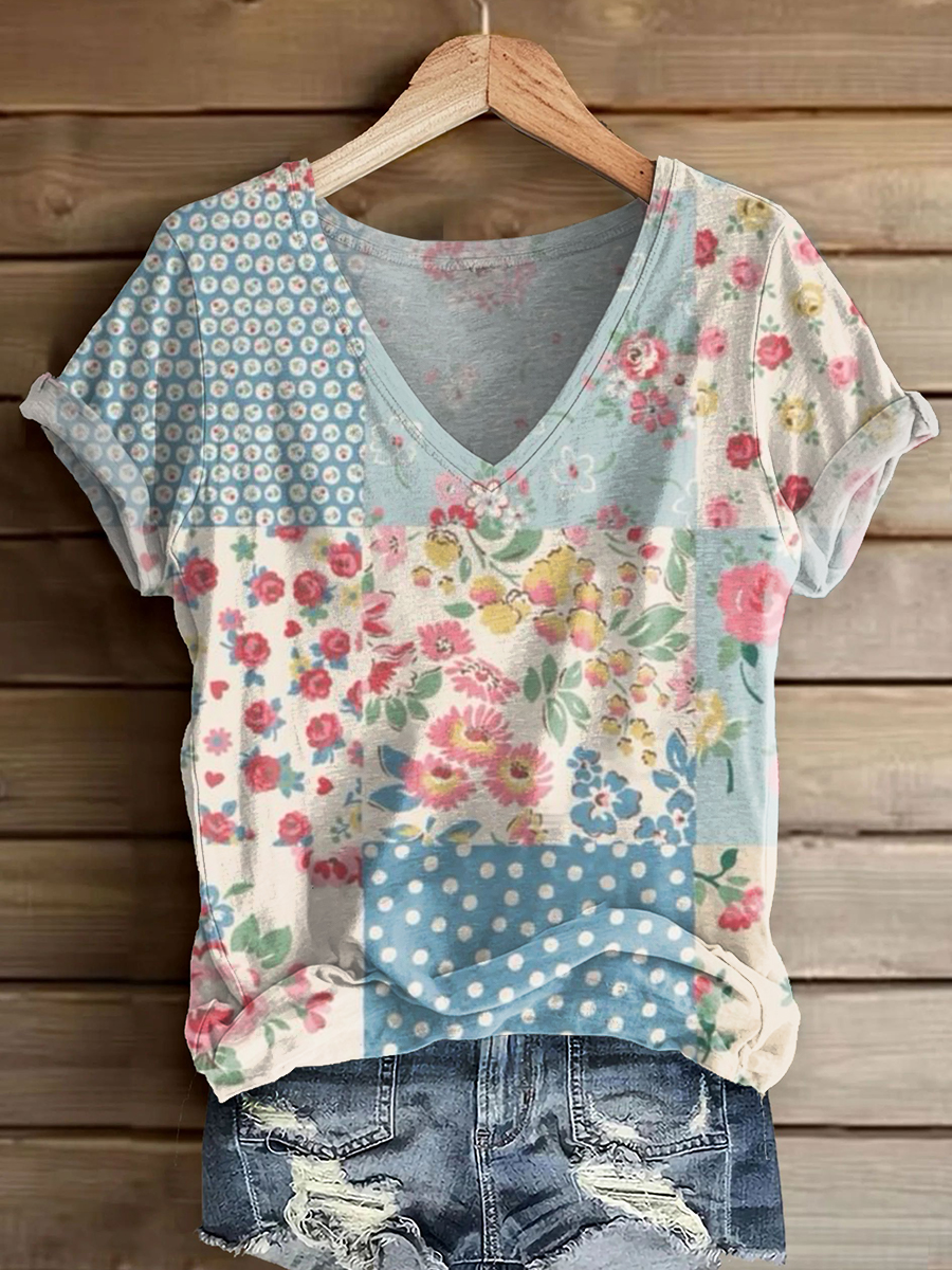 Women's Vintage Floral Patchwork Art Print V-neck Casual T-Shirt