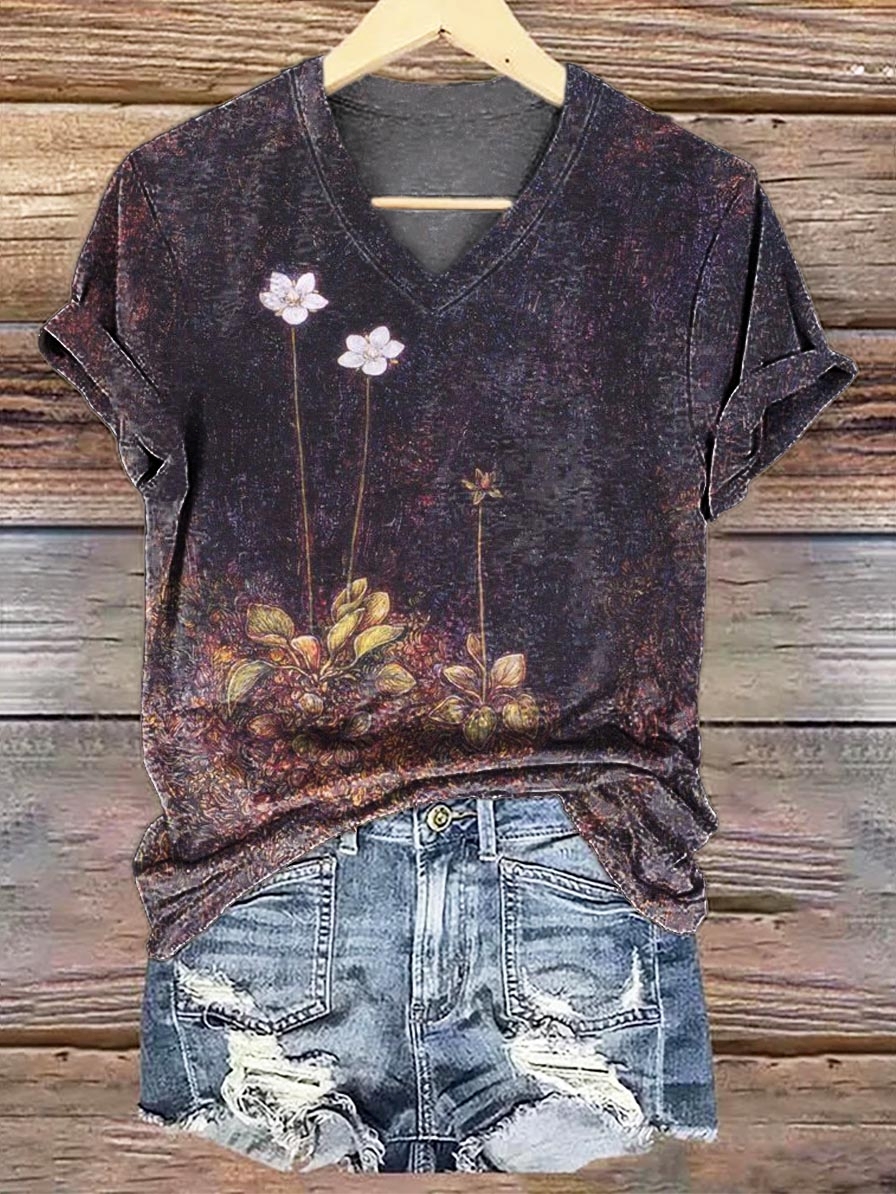 Women's Vintage Floral Print V-Neck Comfort Cotton T-Shirt
