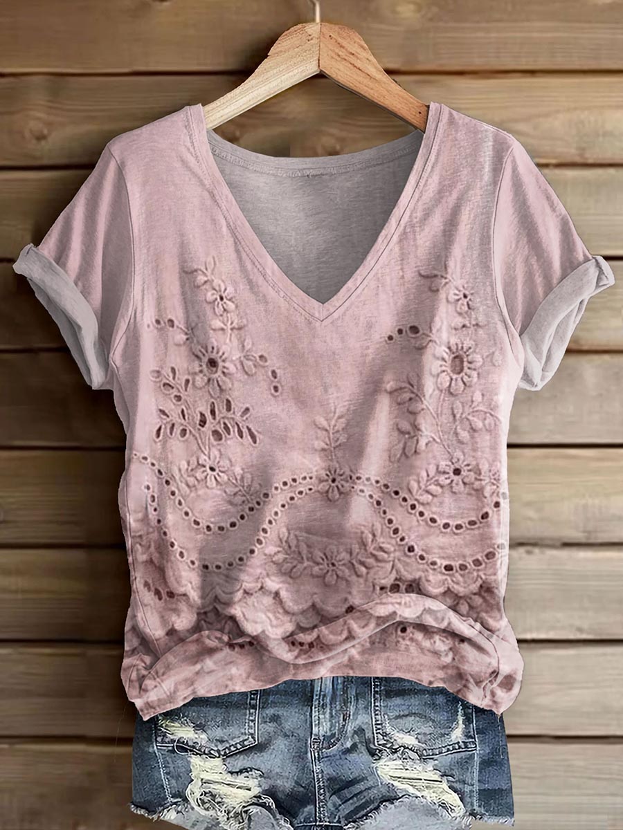 Women's Vintage Floral Texture Art Print V-neck Casual T-Shirt