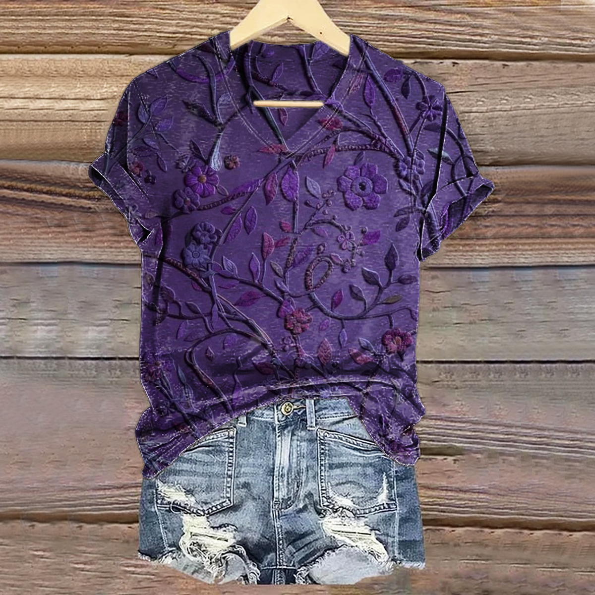 Women's Vintage Floral Texture Art Print V-neck Casual T-Shirt