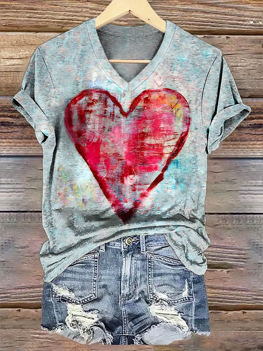 Women's Vintage Graffiti Heart Art Pattern Print V-neck Casual T-Shirt