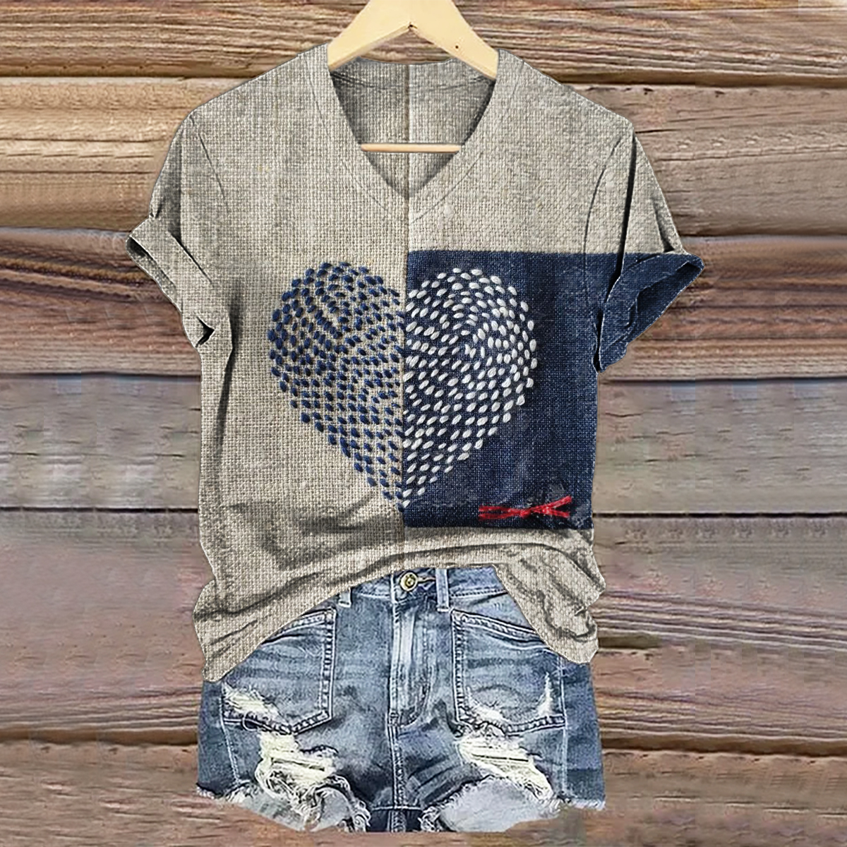 Women's Vintage Heart Pattern Art Print V-neck Casual T-Shirt