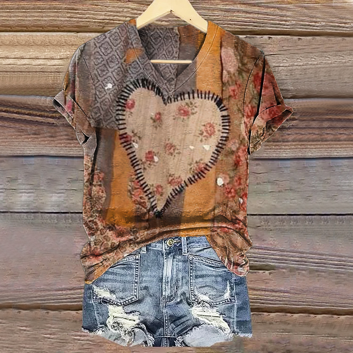 Women's Vintage Heart Pattern Art Print V-neck Casual T-Shirt