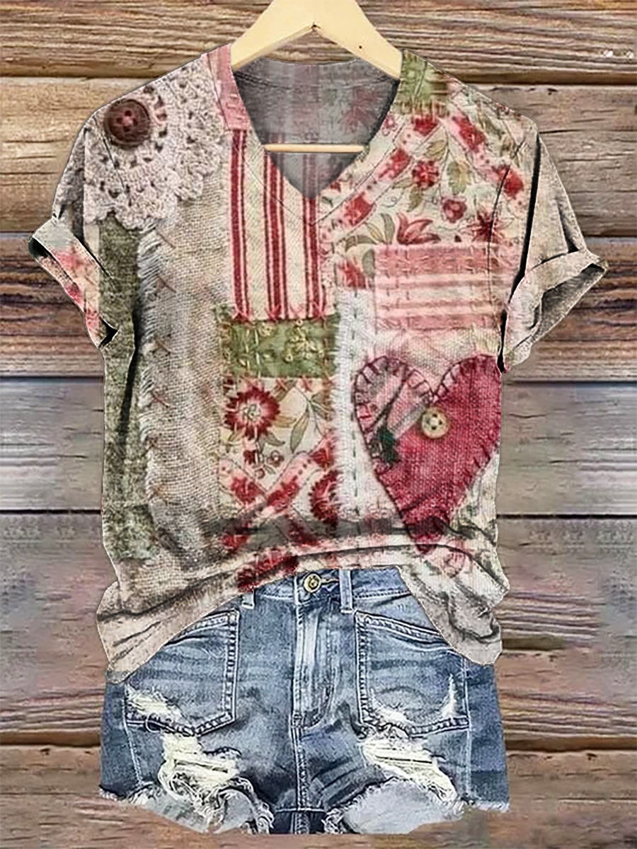 Women's Vintage Heart Texture Art Print V-neck Casual T-Shirt