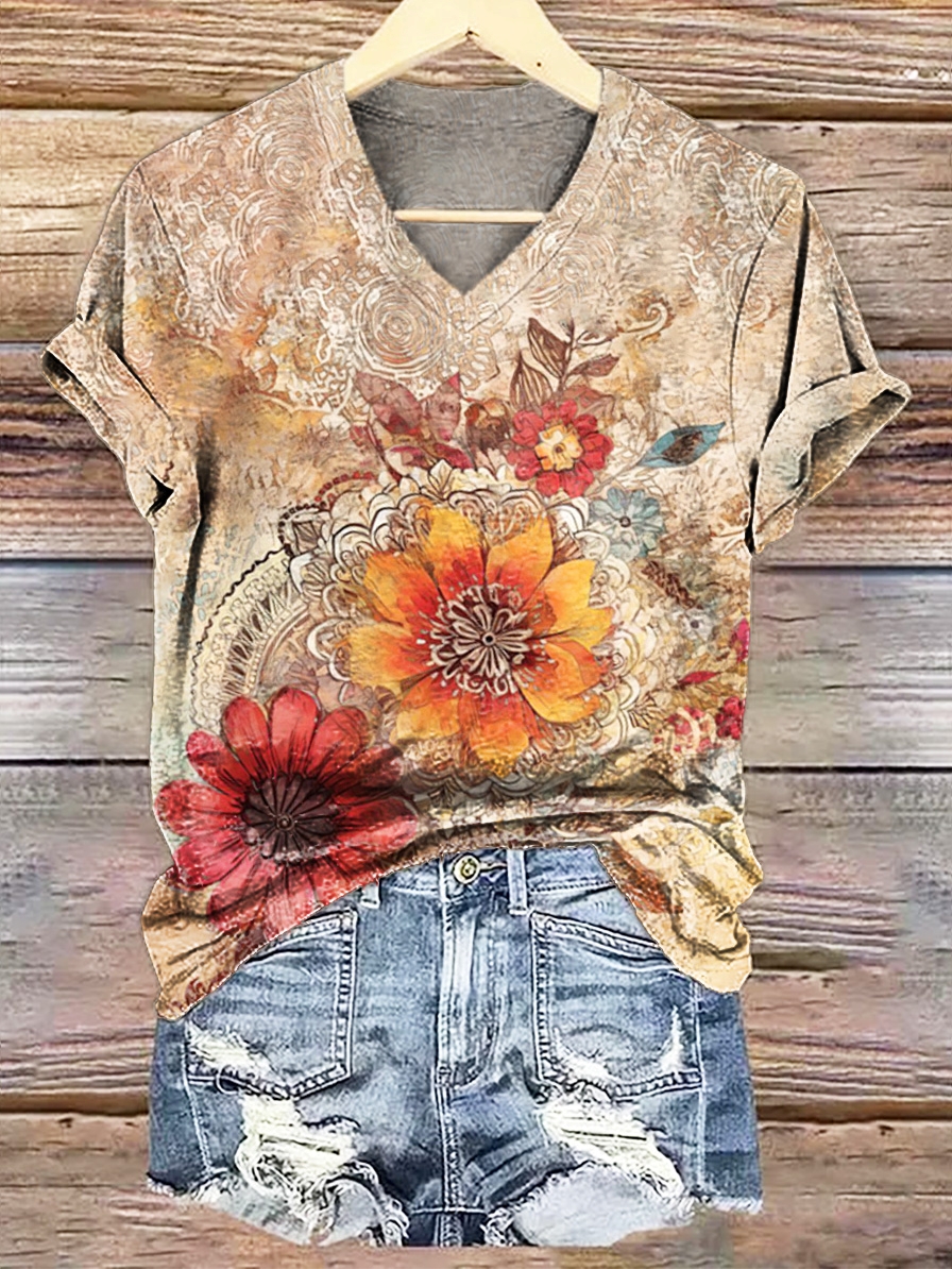 Women's Vintage Watercolor Floral Art Pattern Printed Casual V-neck T-shirt